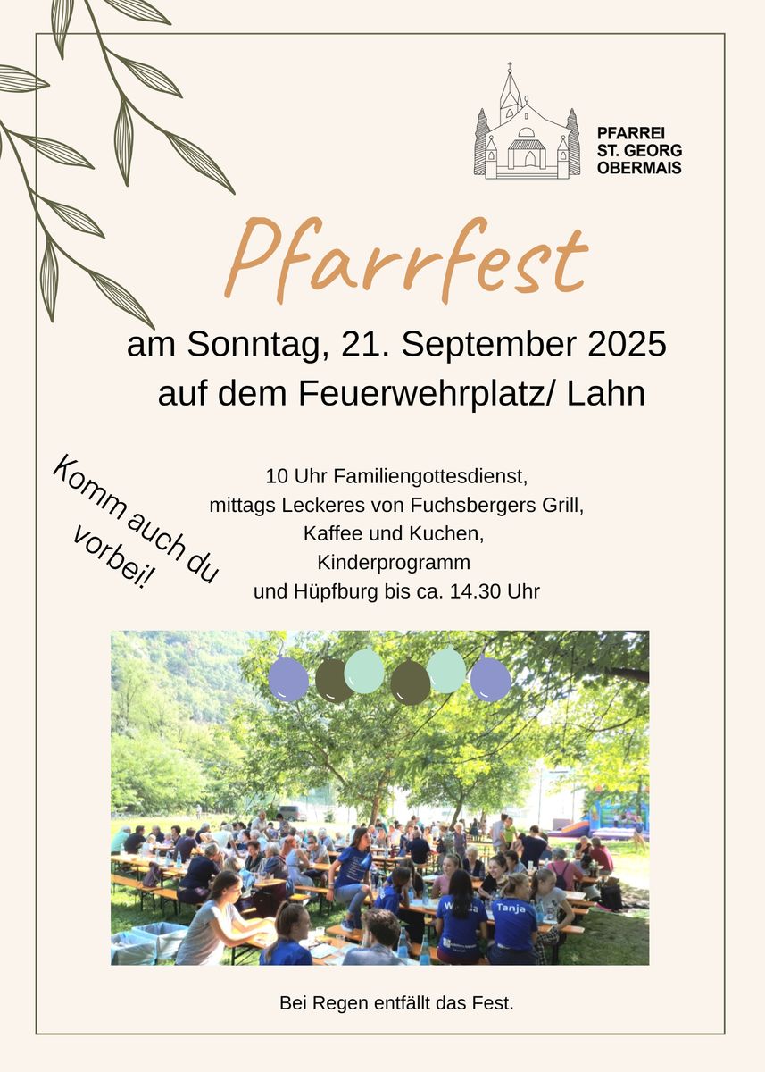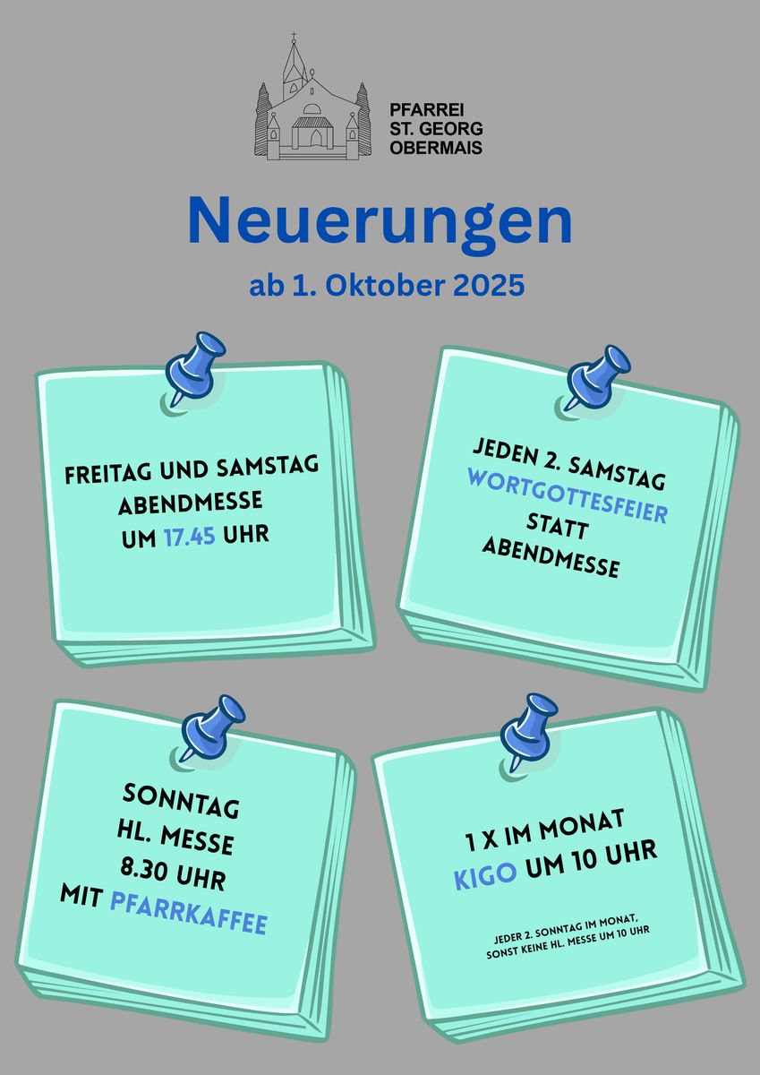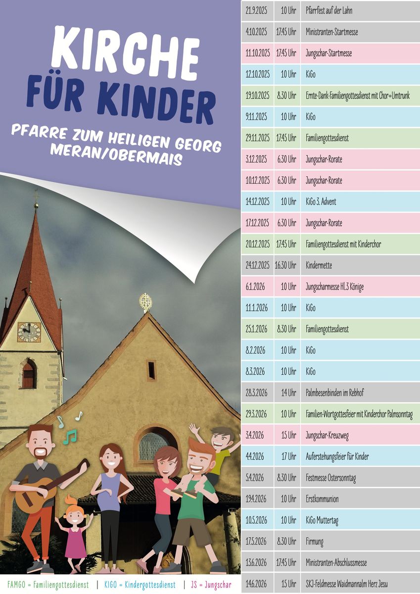 jeden Sonntag 8.30 und am 2. Sonntag im Monat 10 Uhr KiGo, in den Sommermonaten entfällt die Hl. Messe um 10 Uhr
