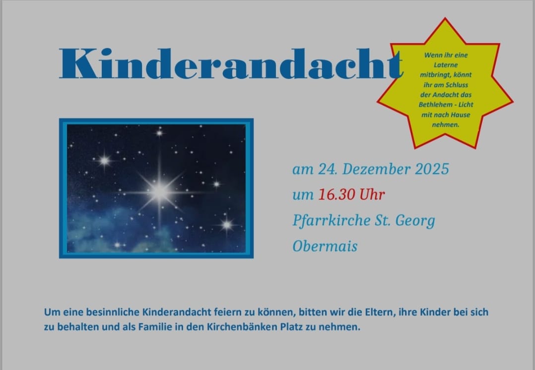Freitag und Samstag: 17:45 Uhr, jeden zweiten Samstag findet statt Hl. Messe eine Wortgottesfeier stattKindergottesdienste